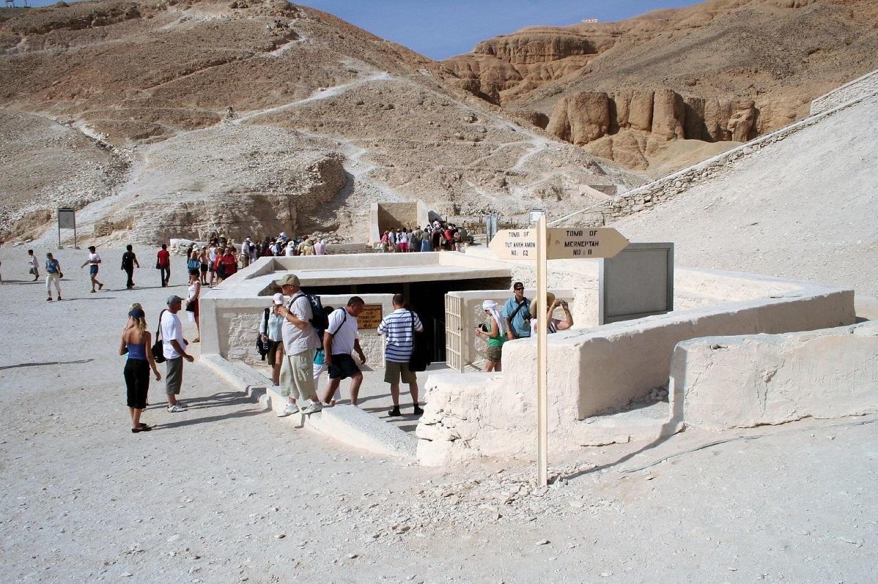 King Tut’s tomb, designated KV62, is situated in the eastern branch of the Valley of the Kings, positioned between the tombs of Rameses II and Rameses IV.