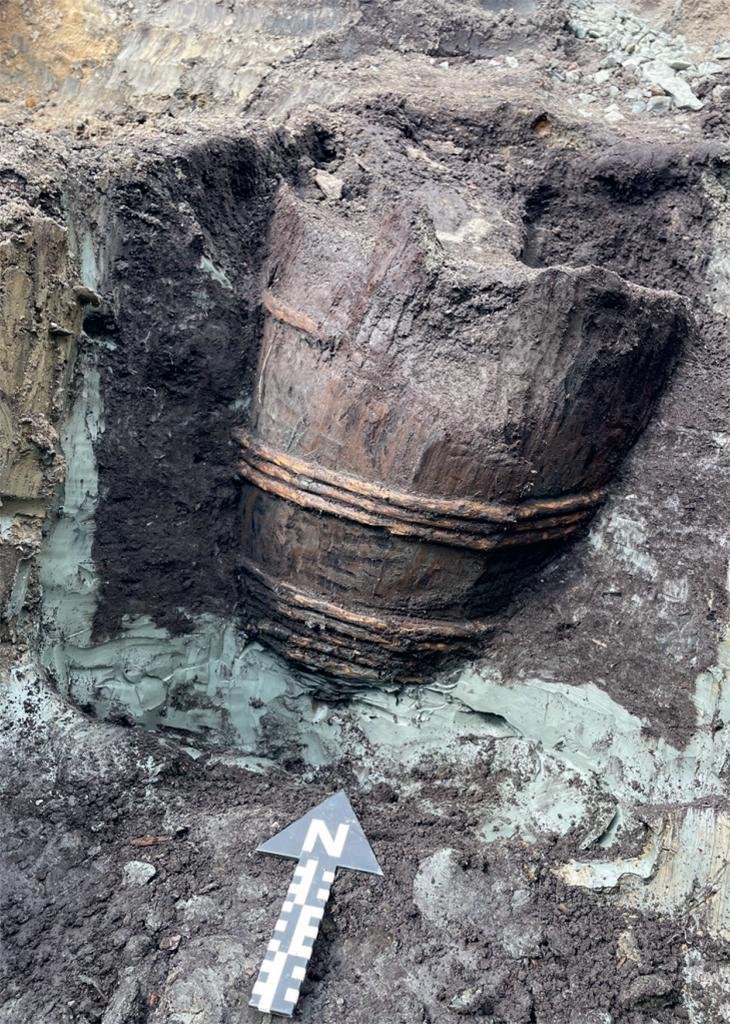 Around 1530, an earth rampart and moat were constructed along the southern boundary, delineating a new defensive perimeter for Nya Lödöse. Where the city’s main street crossed this boundary, a stone-paved gate was built — the southern gate — probably serving as an entrance and checkpoint. Excavations revealed timber foundations, palisades, and reinforcements around the gate, along with a nearby structure that may have served as a tollhouse.