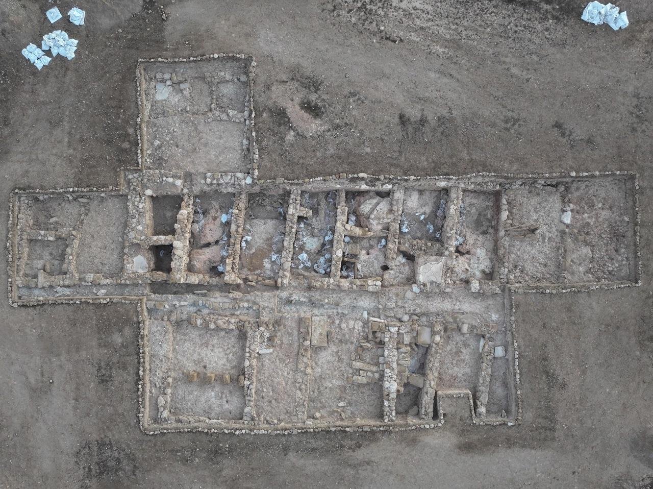 Archaeologists uncovered at least four structures in this area: the largest, rectangular in plan, was composed of rows of rooms that were subsequently divided by interior walls, and thus had been remodeled over time. To the south lay another two buildings, one of which had a large hall supported by stone bases. Another structure located east of it, built on a different alignment, suggests either a different construction phase or a later modification.
