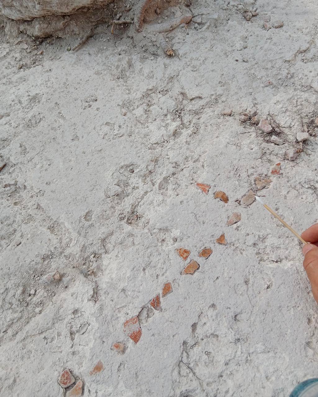 The patolli consists of tiny tesserae—1–3 cm sherds of red and orange pottery—set in a rectangular layout crossed by a central axis, the traditional Mesoamerican board pattern. A digitized reconstruction shows that the board probably measured about 80 × 110 cm, with close to 478 tesserae arranged in some 45 squares. Many fragments came from worn household vessels, including Early Classic types such as Dos Hermanos Red and Aguila Orange.